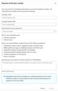 点击右侧的“Manage model access”,再点击 Anthropic 的 Request,提交公司信息。